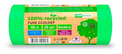 Пакеты для мусора биоразлагаемые 60л, 25 мкм, 20 шт. ПВД, зеленые