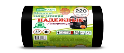 Мешки мусорные 220 литров, 45 мкм, 25 шт, ПВД, черные