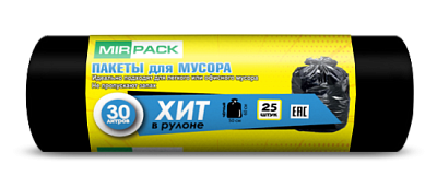 Мешки для мусора объемом 30 литров в количестве 25 штук. Эти мешки изготовлены из полиэтилена низкой плотности (8 мкм) и имеют черный цвет. Производитель данного товара - компания Mirpack. Эти мешки отлично подходят для использования в домашних условиях или на предприятиях. Они прочные и надежные, что позволяет избежать проливания мусора. Весь процесс утилизации становится гораздо более удобным и гигиеничным благодаря нашим мешкам для мусора. Приобретите эти мешки прямо сейчас по доступной цене и решите свои проблемы с мусором легко и быстро.