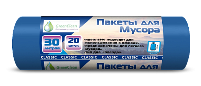 Мешки для мусора 30 л 7 мкм синие GreenClean (ПНД, в рулоне 20 шт, 50х60 см)