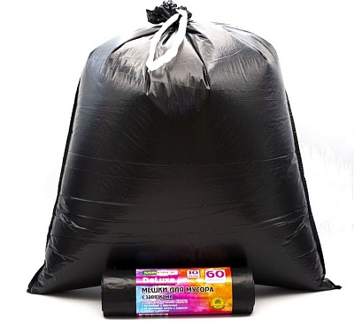 Мешки для мусора 60 литров с завязками, 30 мкм, в рулоне 10 штук, ПСД, черные 50х60 см, 3 слоя, Deluxe