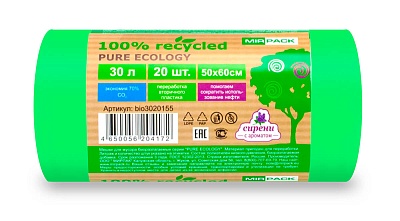 Пакеты для мусора биоразлагаемые 30л, 30 мкм, 20 шт. ПВД, зеленые