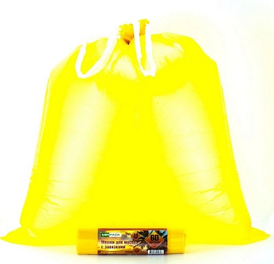 Пакеты для мусора с завязками 60 литров, 15 мкм, 10 шт. ПНД, желтые, + ленты для затягивания